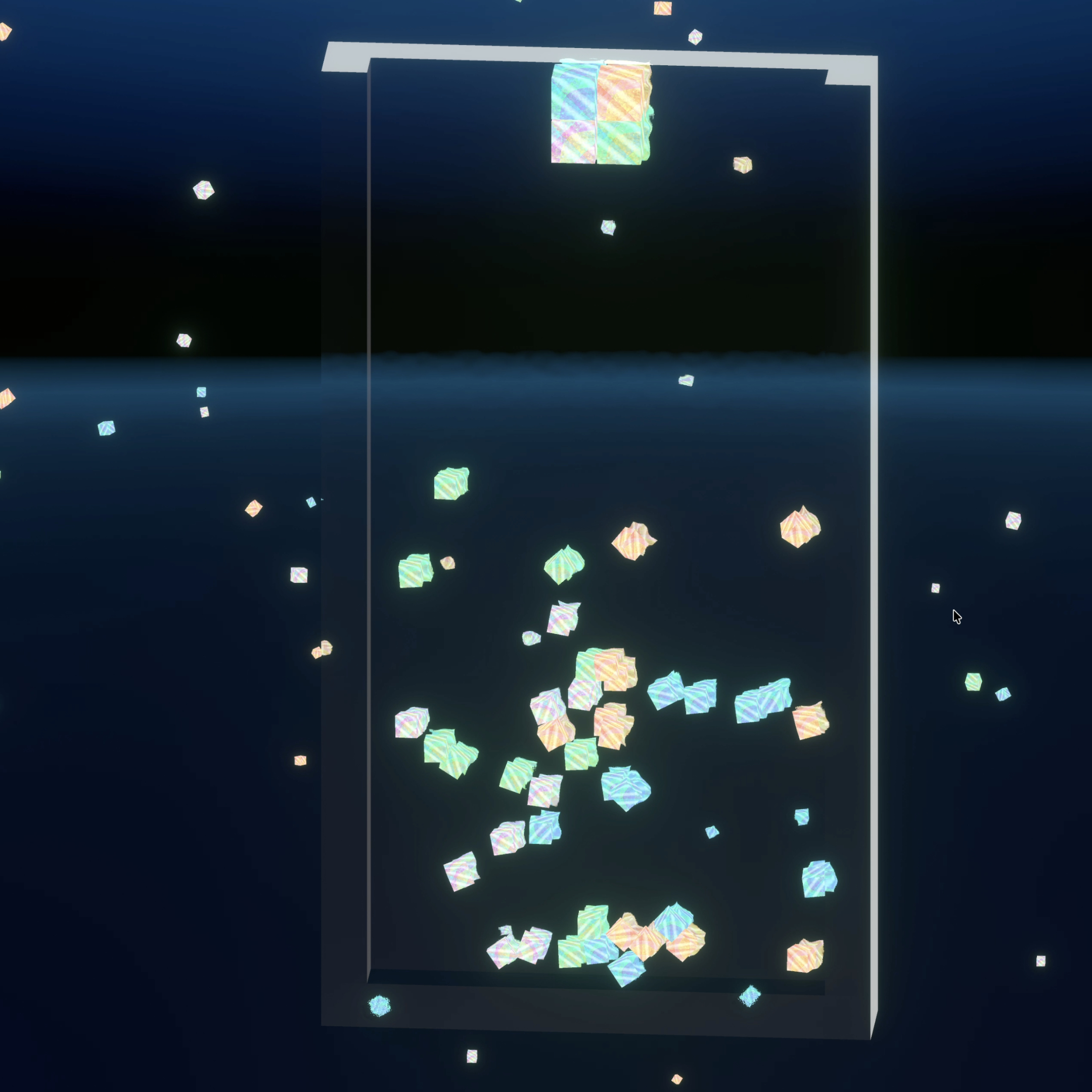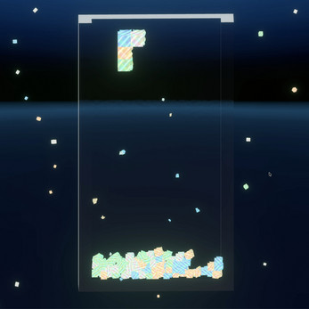 In this version, fragments of Tetromino blocks fall slowly. The system is made so the space never becomes fully filled, but also never becomes completely empty. It guides the player toward a middle place, away from both extremes.